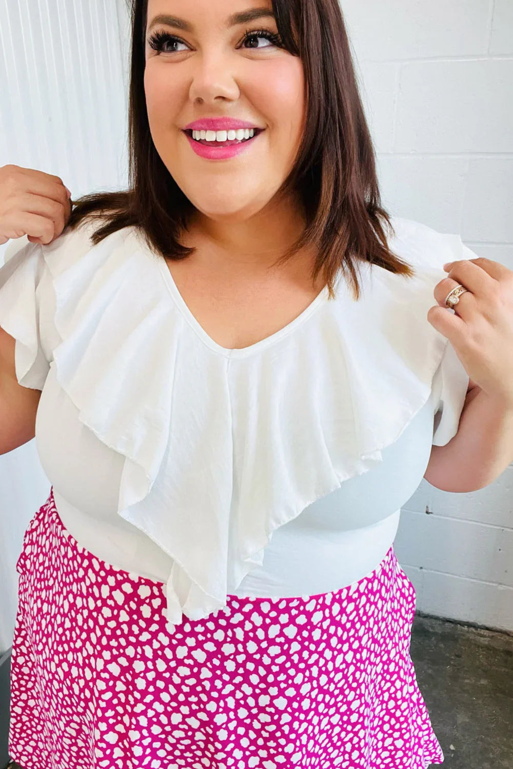 Make a romantic statement with this ruffle V neck sleeveless midi dress featuring a Twofer design and flowy, woven fuchsia animal print. With side pockets and a fit and flare hemline, this stunning dress is perfect for warming weather.