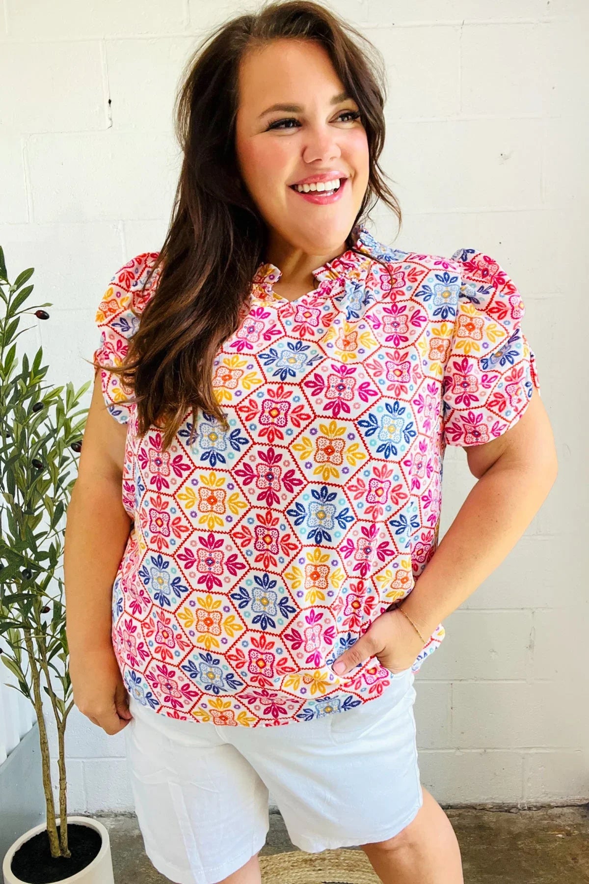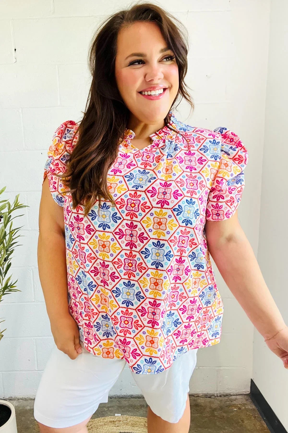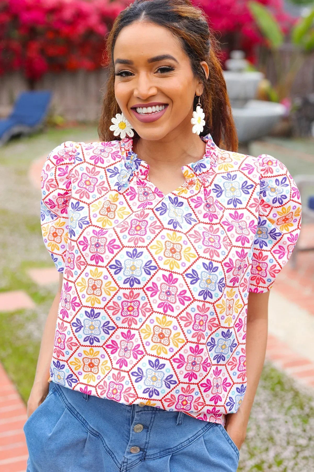 Brighten your casual closet while adding a touch of femininity with this floral lace print shirred puff sleeve top made with soft woven fabric. A stunning frill notch neck completes this versatile top.
