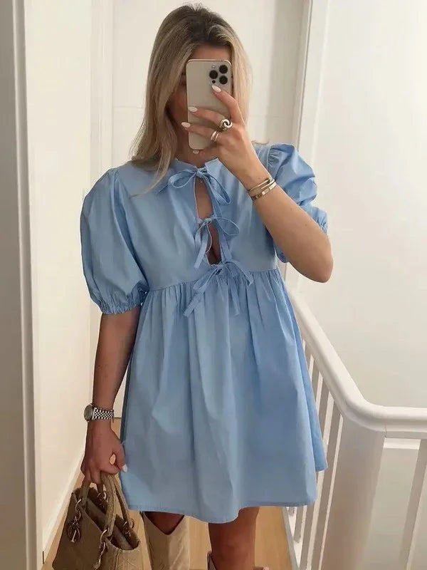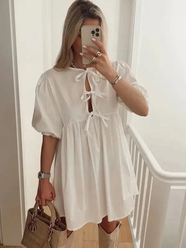 Crafted with care in China, this babydoll dress features a charming bow tie front that adds a touch of femininity to your ensemble. The flattering silhouette and lightweight fabric flow beautifully, making it a versatile addition to your wardrobe.