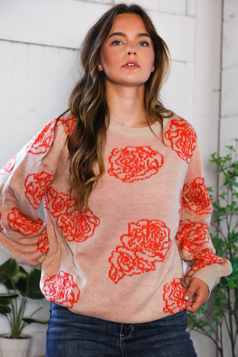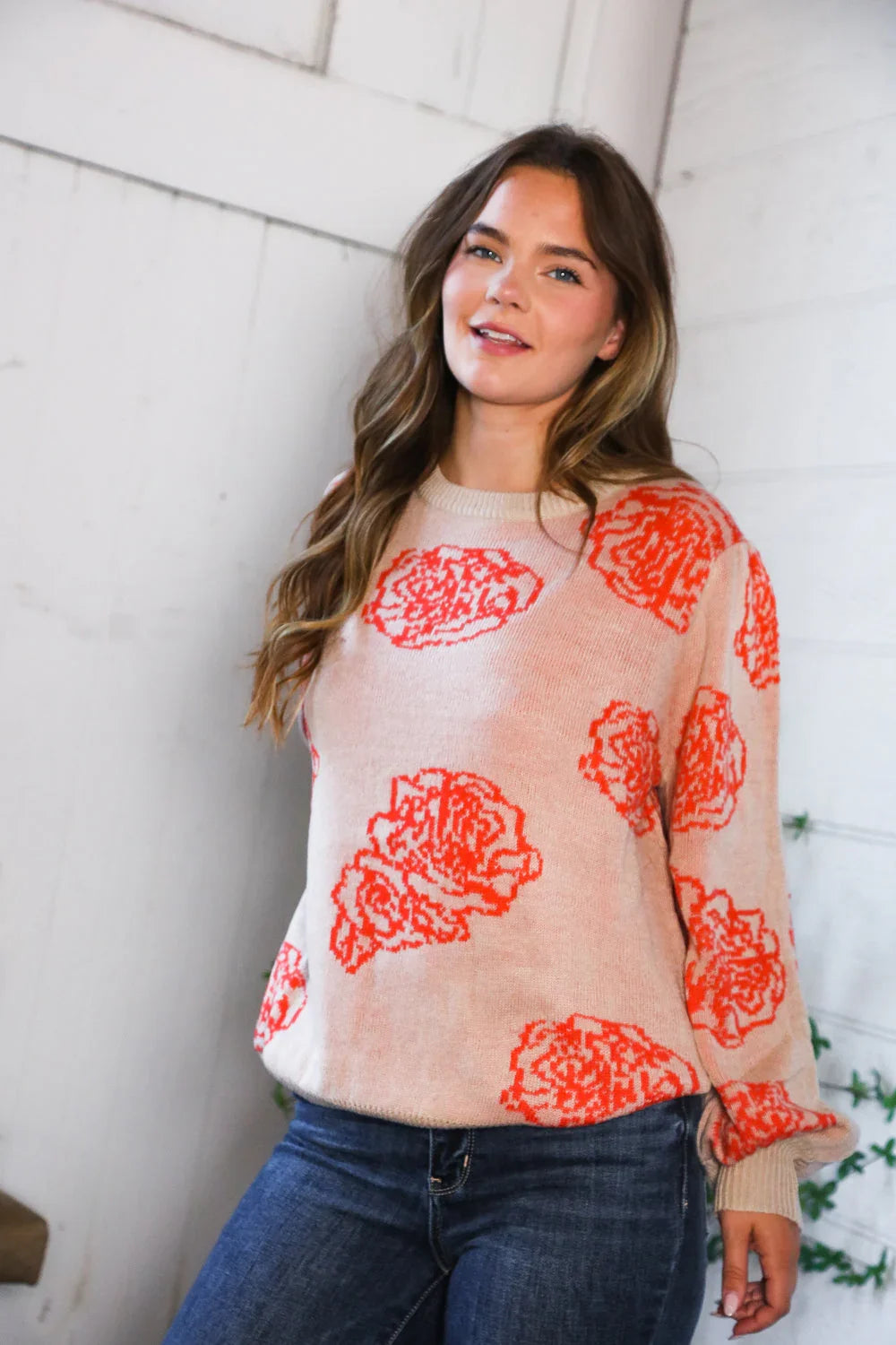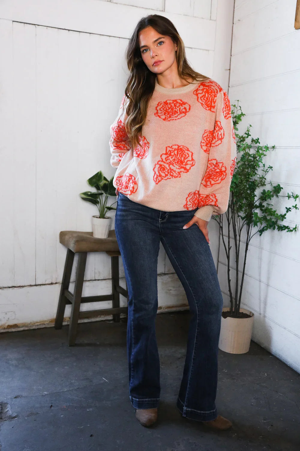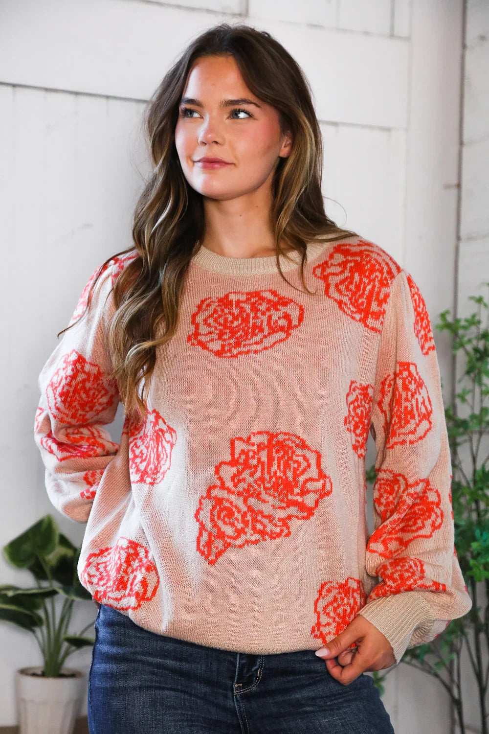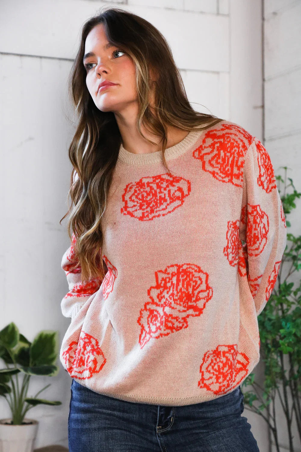 This sweater is just the right mix of cozy and fun. The soft oatmeal knit is scattered with coral rose designs that really pop, giving it a sweet but playful vibe. It’s got a relaxed fit with ribbed cuffs and hem, so it hangs just right over jeans or a cute skirt. The fabric feels super soft. It's the perfect weight to layer under a coat on those extra cold days.