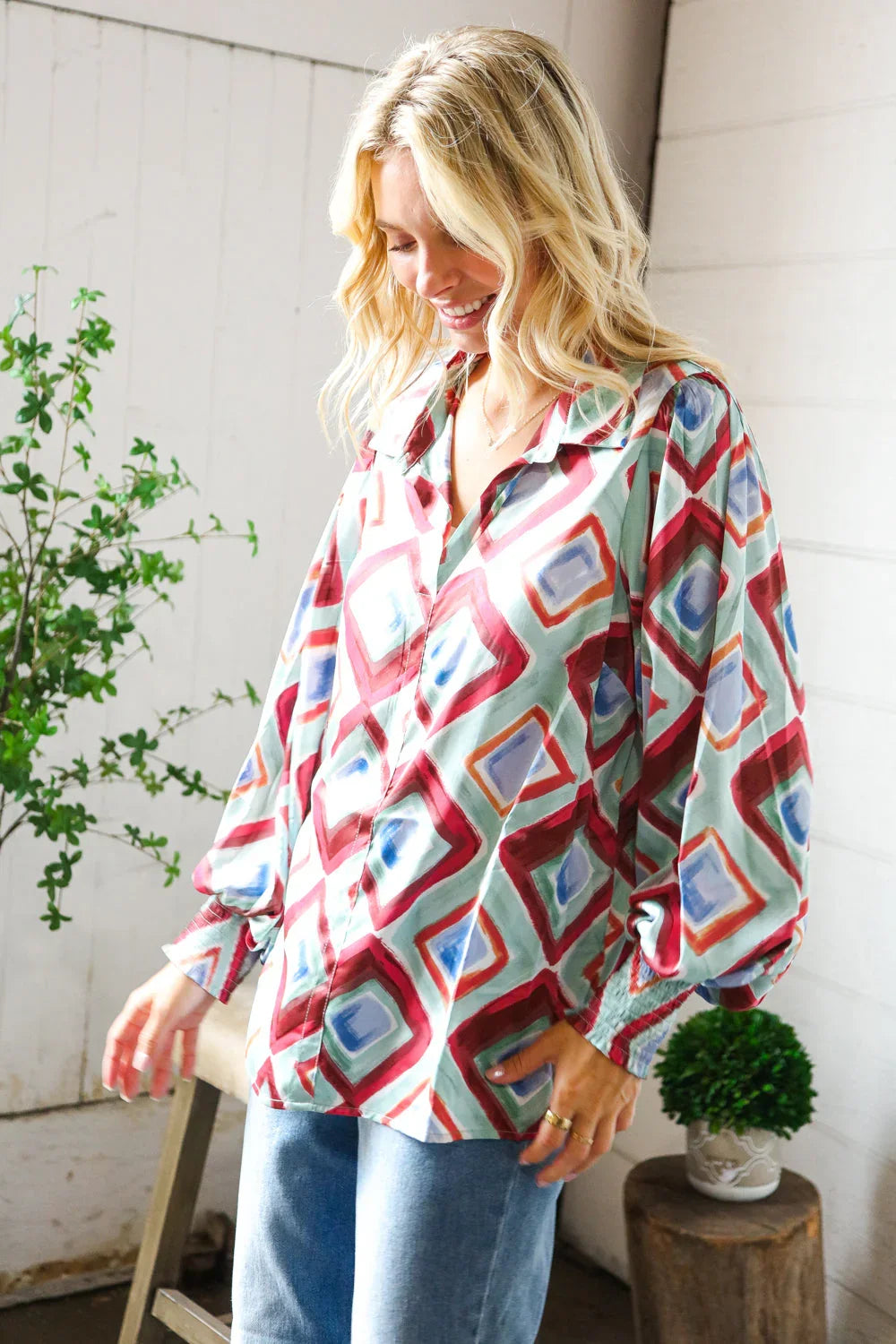 Mint To Be V Neck Bubble Sleeve Silky Collared Blouse