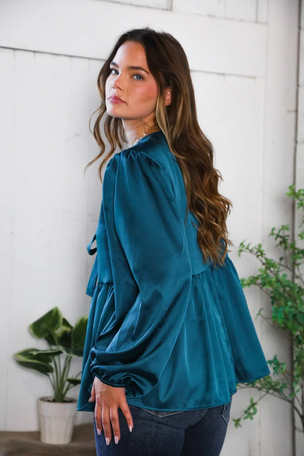 This satin top is such a pretty statement piece. The deep teal color is perfect for fall but it works great for the holidays as well! It’s got three sweet little bow ties down the front that give it a feminine and cute touch. The fabric has that smooth, silky feel that drapes so nicely. The flowy fit is comfortable and still looks polished. We like pairing it with dark denim and boots for a dinner out..