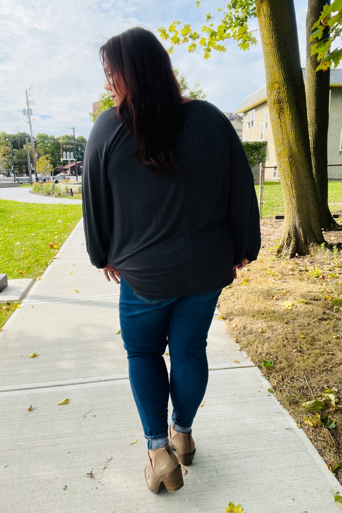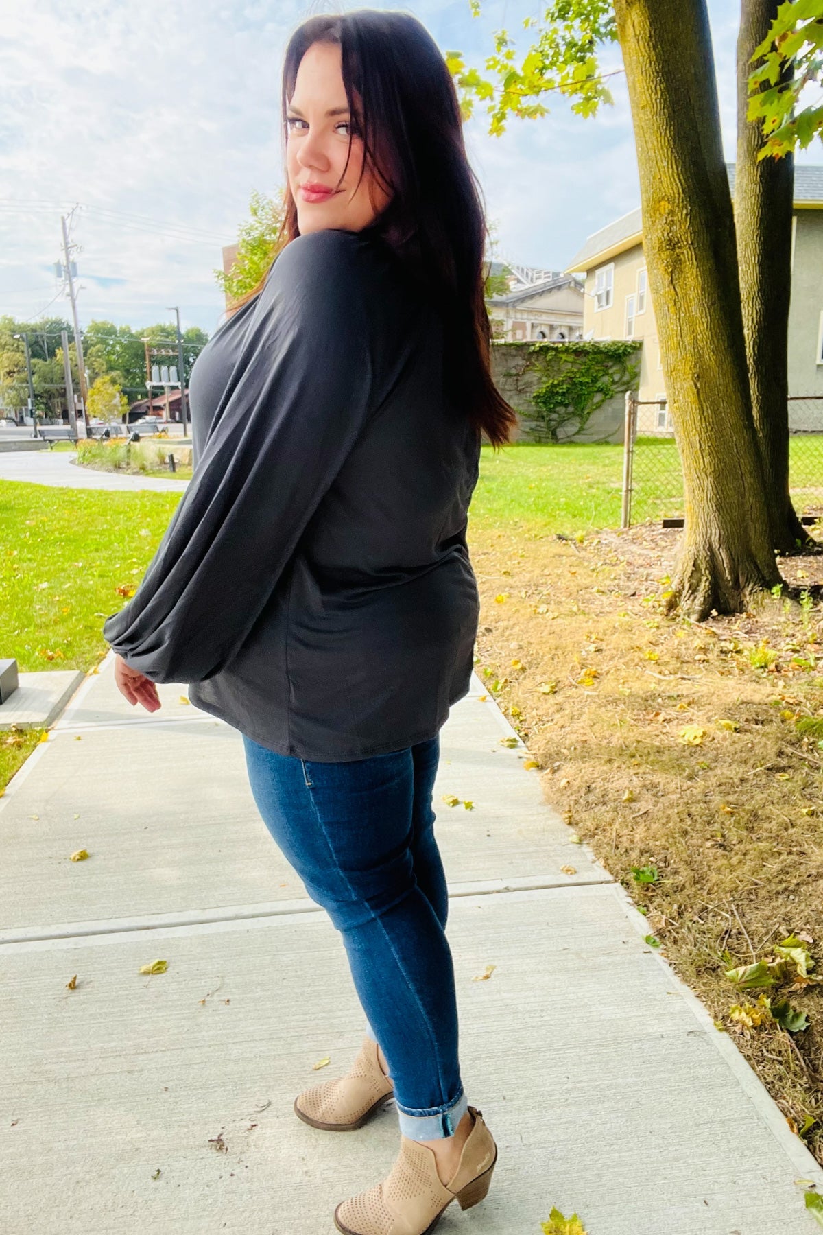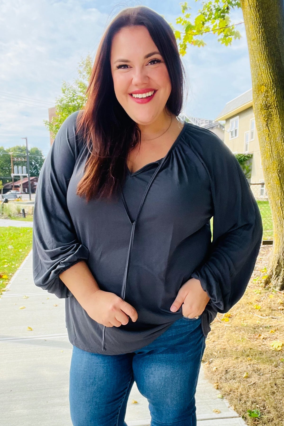 • Versatile Charcoal Front Tie Modal Knit Peasant Top